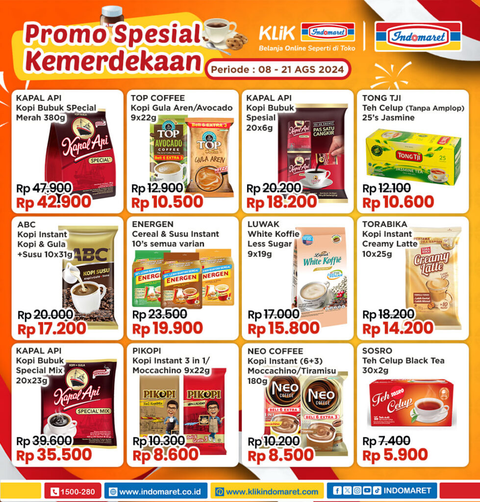 Beberapa barang yang promo antara lain Kopi kapal Api bubuk spesial 380 gram di harga Rp 42.900, Top Cofee Gula Aren 9X22 gram di harga Rp 10.500, Kapal Api kopi bubuk Spesial 20X6 gram di harga Rp 18.200, Tong Tji teh celup di harga Rp 10.600, ABC Kopi Instan 10X31 gram di harga 17.200, Luwak White Coffe Less Sugar 9X19 gram di harga 18.500, Torabika Kopi Instagm Creamy Latte 10X25 gram di harga 14.200, Kapal Api bubuk spesial Mix 20X23 gram di harga 35.500 serta teh celup Sosro di harga 5.900.